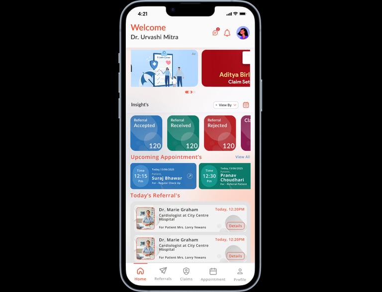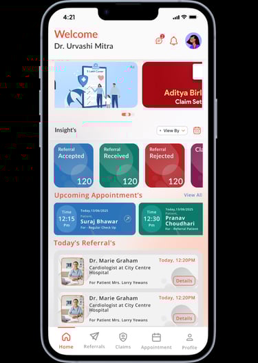 REFERRALS (Inward & Outward): Refer the patient to a colleague on the App for specific treatment; or forward the patient for further treatment. Receive referrals from colleagues on the App, accept and confirm the patient appointment. If you are Specialised or Super Specialised in your field, referrals can be your important source of patient flow.